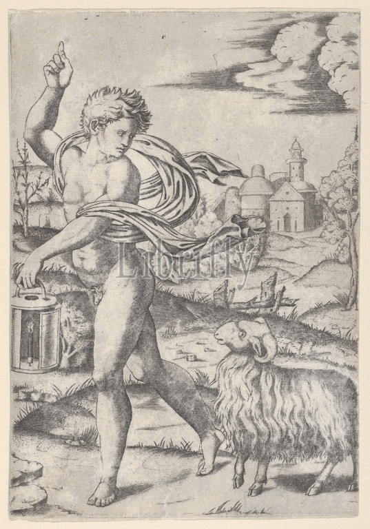 naked young man walking left, carrying, lantern, looking backwards, shoulder, ram, ca, 1510–27, Engraving, Sheet, 7 5/16, 5 1/16, 18.5, 12.9 cm, Prints, Marcantonio Raimondi, Italian, Argini, ca., 1480–before, 1534, Bologna, possibly, after Raphael, Raffaello Sanzio or Santi, Urbino, 1483–1520, Rome