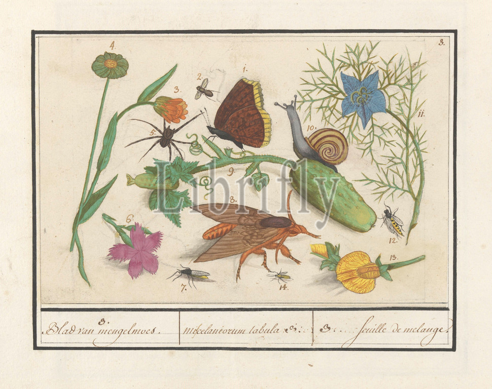 Natural history ensemble, no, 3, Leaf, hodgepodge, Miscelaniorum tabula 3, feuille de melange, title, object, Sheet, third natural history ensemble, animals, plants, numbers 1-14, Insects, flowers, snail, spider, cucumber, Numbered top right, Part, seventh album, drawings, reptiles, amphibians, natural history ensembles, seventh, twelve albums, watercolors, birds, 1600, commissioned, Emperor Rudolf II, explanations, Dutch, Latin, French, insects, molluscs, spiders, Elias Verhulst, attributed, 1596, 1610, paper, pencil, chalk, watercolor, paint, deck paint, ink, pen