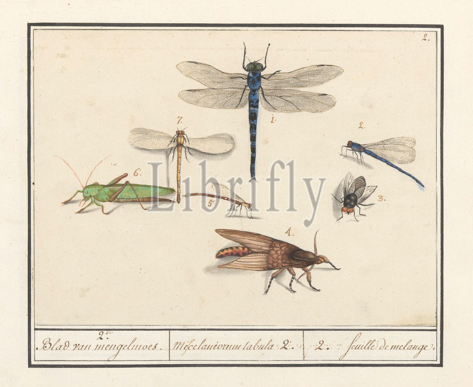 Natural history ensemble (no. 2), 2. Mixture / Miscelaniorum tabula leaf 2. / 2. feuille de melange (title on object), Leaf with the second natural history ensemble with animals and plants, numbers 1-7. Insects, dragonflies, grasshopper. Numbered top right: 2. Part of the seventh album with drawings of reptiles, amphibians and natural history ensembles. The seventh of twelve albums with watercolors of animals, birds and plants, known around 1600, commissioned by Emperor Rudolf II. With explanations in Dutch, Latin and French, insects, insects: grass-hopper, insects: dragon-fly, Elias Verhulst (attributed to), 1596 - 1610, paper, pencil, chalk, watercolor (paint), deck paint, ink, pen, h 170 mm × w 230 mm