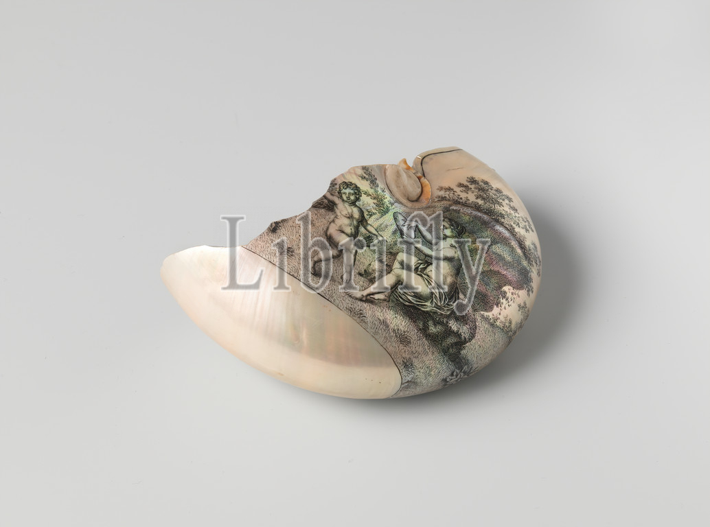 Nautilus shell, engraved with a dancing Bacchus child and with nymph and amor, An engraved and black-rubbed nautilus shell. On one side a nymph with a triangle and a dancing Bacchus child and on the other side a nymph with a tambourine and a dancing Amor., Cornelis Bellekin (attributed to), Amsterdam, 1650 - 1700, mother of pearl, engraving, h 10.7 cm × w 9.8 cm × d 6.8 cm