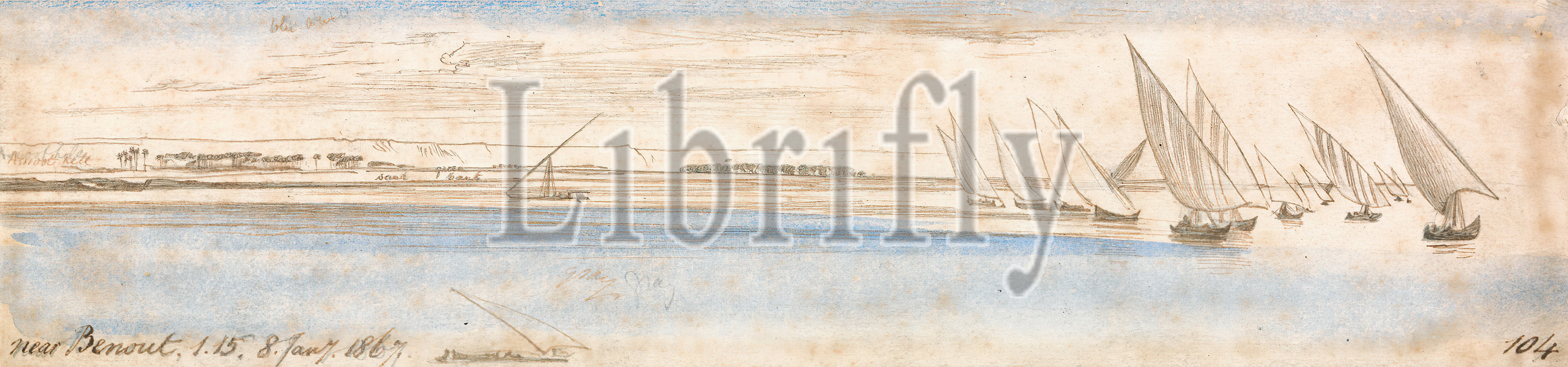 Benout, Edward Lear, 1812–1888, British, 1867, Watercolor, graphite, pen, brown ink, moderately thick, moderately textured, beige wove paper, Sheet, boats, landscape, marine art, river, river, sails, sky, water, Africa, Egypt, Nile
