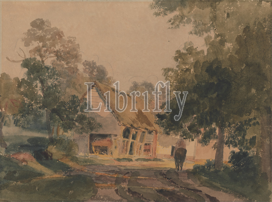 Matlock, pupil, Peter DeWint, 1784–1849, British, Watercolor, graphite, medium, rough, cream wove paper, Sheet, Mount, architectural subject, barns, horses, animals, landscape, path, riders, horseback, roads, sheds, trees, wagons, Derbyshire, Europe, Matlock, United Kingdom