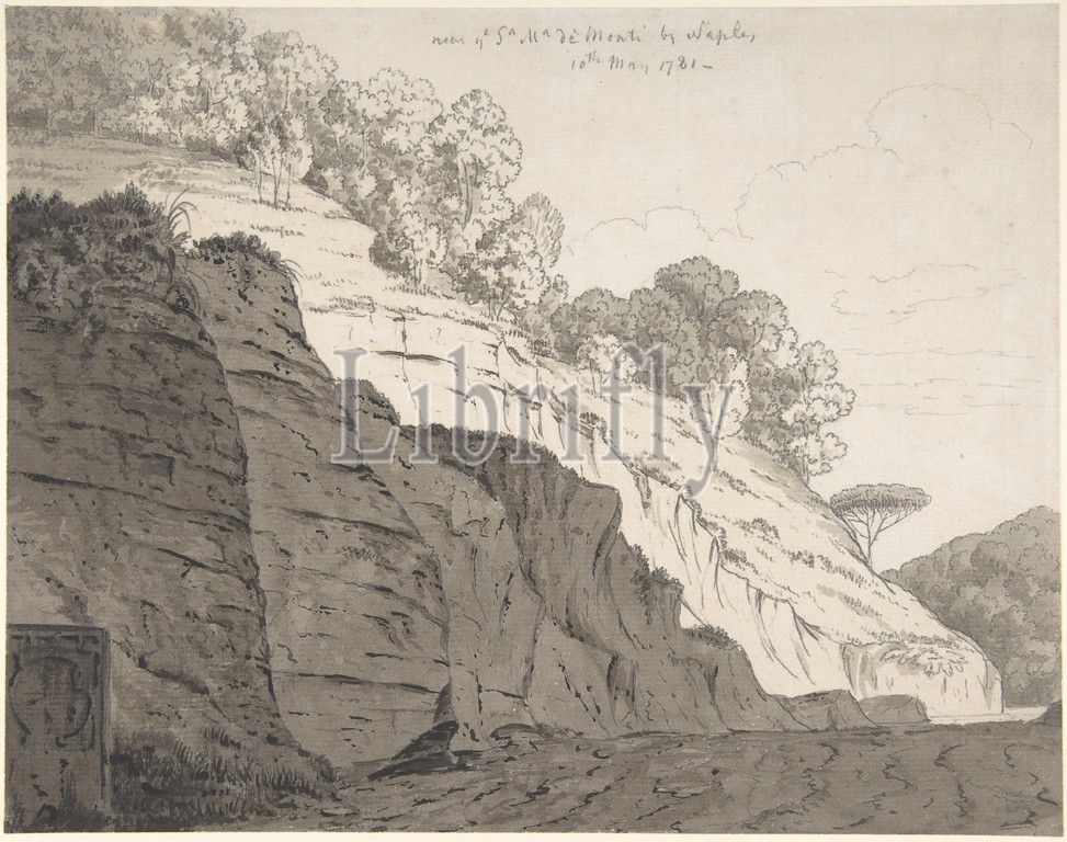 Santa Maria de, Monti, Naples, 10, 1781, Graphite, pen, ink, wash, sheet, 8 3/8 x 14, 21.3 35.6 cm, Drawings, Thomas Jones, British, Trevonen, Wales, 1742–1803, Pencerrig, original British landscape, artists, eighteenth century, Jones lived, Italy, 1776, 1783, drawing, artist, attracted, vistas, discovered, remote road, leading, eastward, out, city, monastery, Maria, dei, described, path, diary, hollow Way, presenting