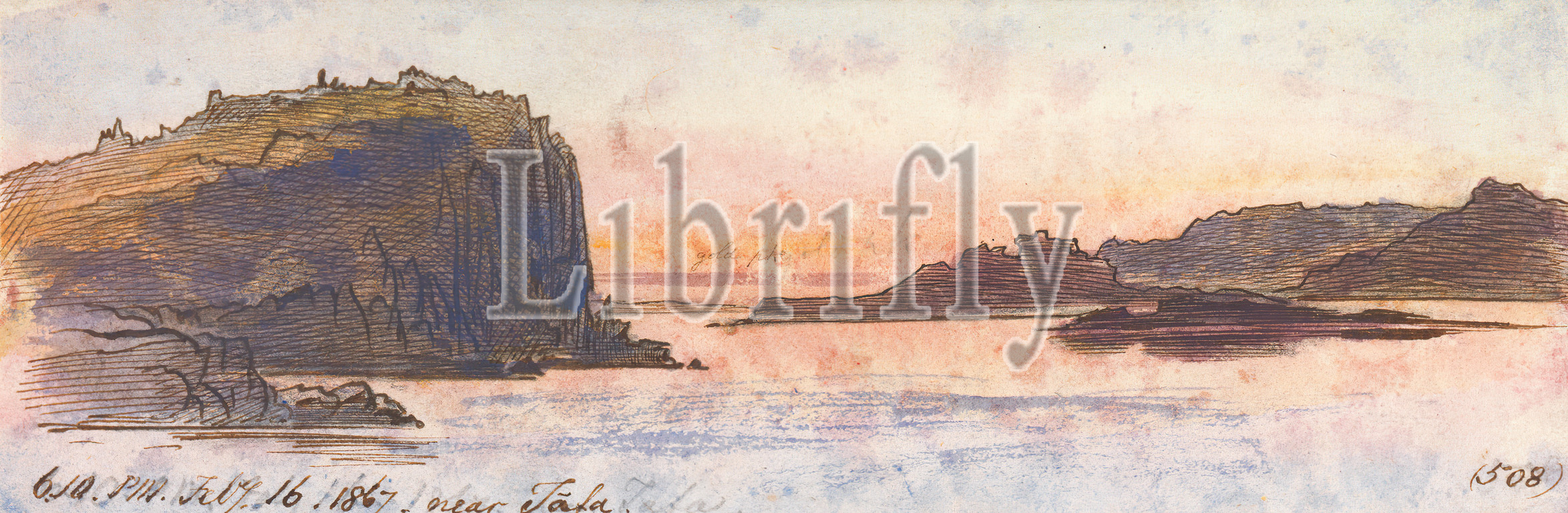 Near Tafa, 6:10 pm, 16 February 1867 (508), Edward Lear, 1812–1888, British, 1867, Watercolor, pen and brown ink, and graphite on medium, slightly textured, cream wove paper, mounted on thick, smooth, cream wove paper, Sheet: 2 1/2 x 7 1/2 inches (6.3 x 19.1 cm), cliffs, landscape, river, river, rocks (landforms), sky, water, Africa, Egypt, Nile, Nubia