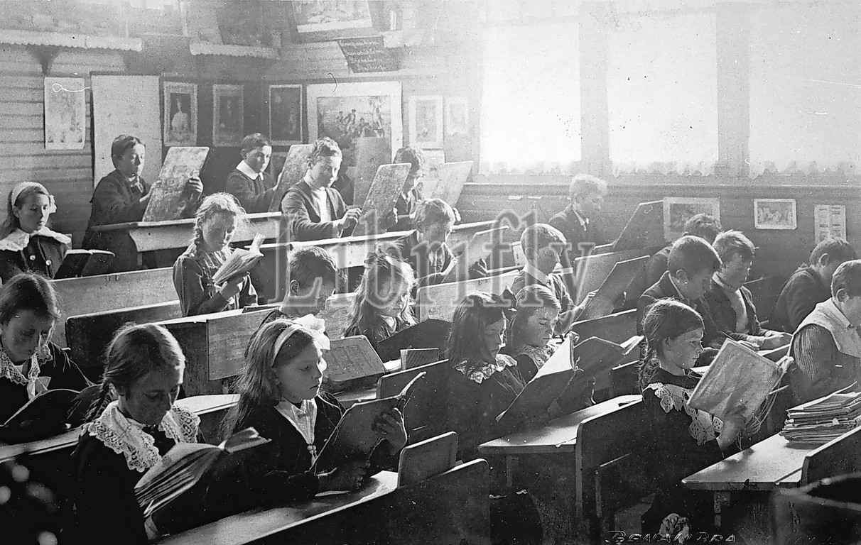 Negative, Benambra, Victoria, circa 1900, Inside, classroom, Benambra State School, pupils, foreground, reading, older pupils, drawing, writing, large slates