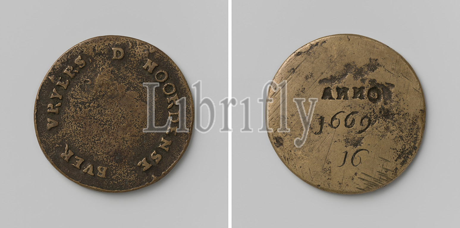 Neighborhood Noordeinde, Hague, neighborhood badge, neighborhood freemen, no, 16, Brass medal, Front side, empty field within, text, Reverse, year, number 16, Noordeinde, 1669, brass, alloy, engraving