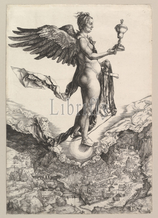 Nemesis, Great Fortune, 1501–2, Engraving, Sheet, 13 1/8 x 9 1/8, 33.3 23.1 cm, trimmed nearly, plate line, Prints, Albrecht Dürer, German, Nuremberg, 1471–1528