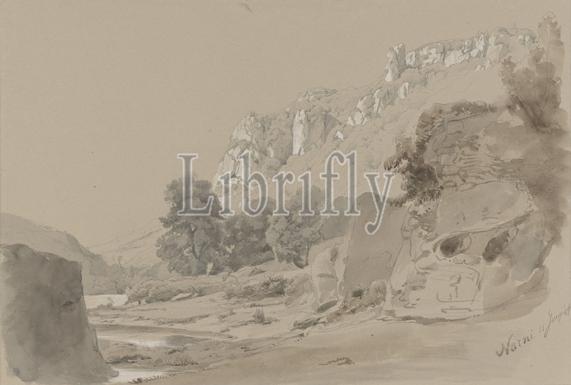 The Nera River near Narni The Nera River near Narni, Drawing from a group of drawings of landscapes and cityscapes in Italy (Rome, Tivoli, Civita Castellana and Pozzuoli)., Rocks, Narni, Pierre Louis Dubourcq, Italy, 1844, paper, deck paint, chalk, brush, h 297 mm × w 439 mm