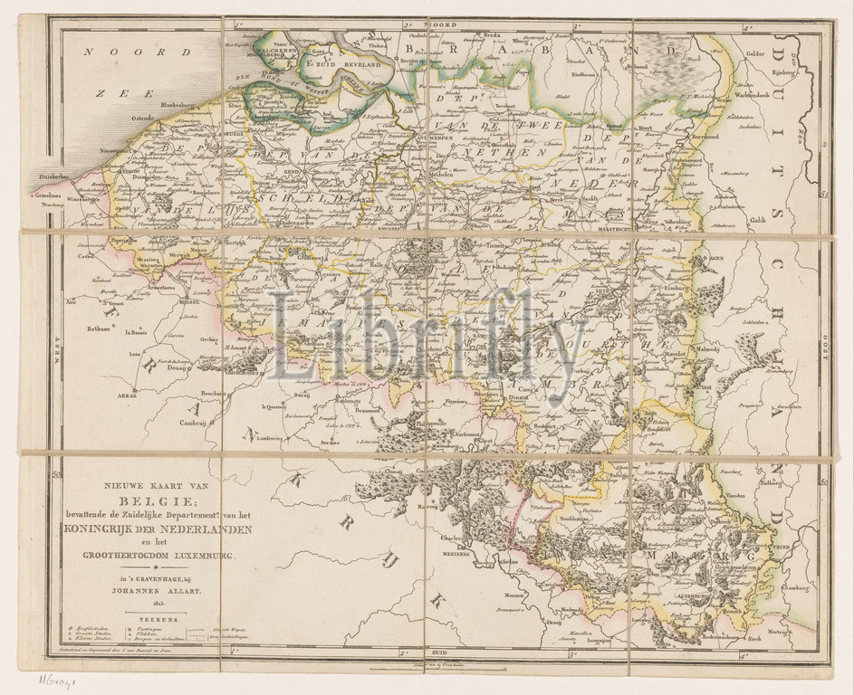 New map, Belgium, containing, Southern Department n, Kingdom, Netherlands, Grand Duchy, Luxembourg, title, object, Map, part, Netherlands marked, red pencil, Ten-day Campaign, August 1831, map consists, 9 separate leaves, stuck, linen, maps, separate countries, regions, army 'en route, troop movements, transportation, C, van Baarsel en Zoon, mentioned, Hague, 1815, paper, material, watercolor, paint, brush