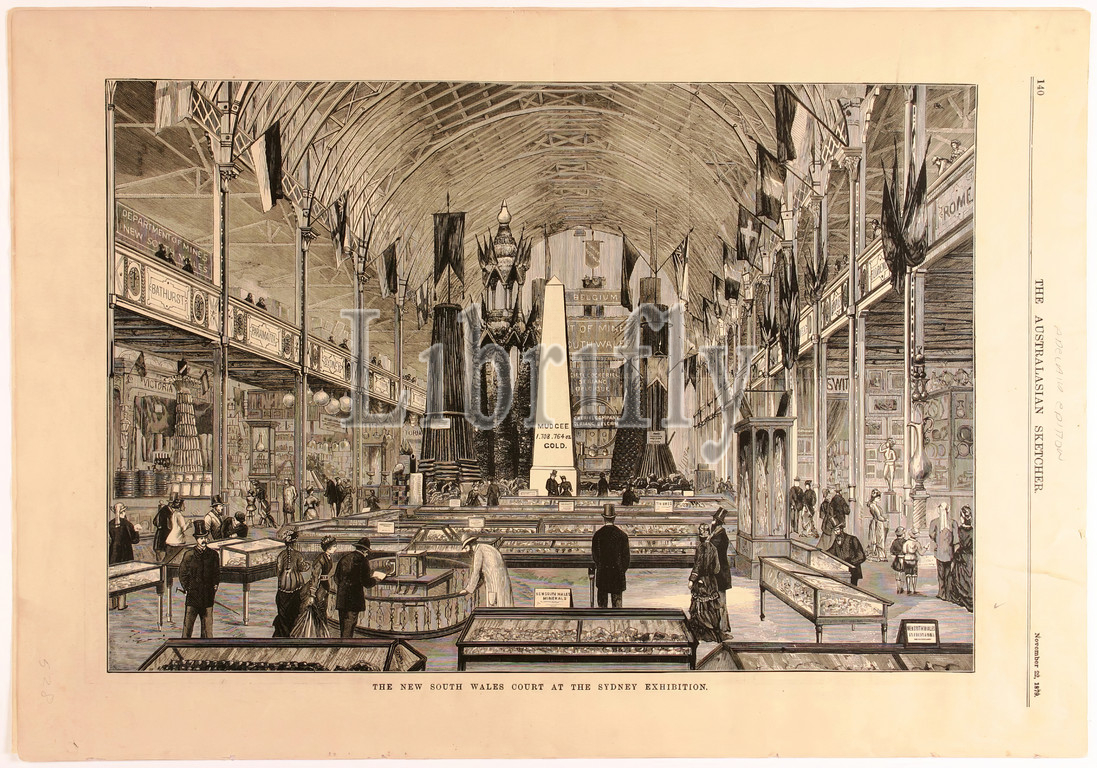 Newspaper Cutting, New South Wales Court, Sydney Exhibition, Australasian Sketcher, Adelaide, 22 Nov 1879, Pages, Adelaide edition, Saturday 22 November 1879, pp, 133-34, 137-40, published, G.N, & W.H, Birks, Page 140 contains, full page black & white wood block engraving, Sydney International Exhibition, 1879, 17 September 1879, 20 April 188, occupied ten