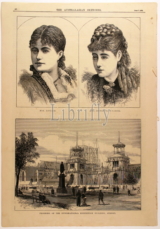 Newspaper Cutting, Progress, International Exhibition Building, Sydney, Australasian Sketcher, Melbourne, 7 Jun 1979, Double-sided page, pp, 39-40, country edition, Wednesday 4 June 1879, published, Wilson & McKinnon, bottom half, p, 40, engraving illustrating, construction, Garden Palace, site, Sydney International Exhibition, held, 1879