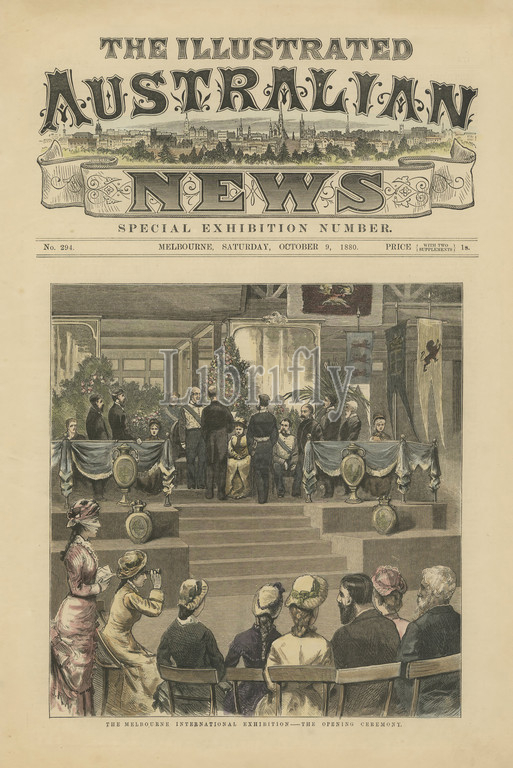 Newspaper Extract - 'The Opening Ceremony', The Illustrated Australian News, Melbourne, 9 Oct 1880, Hand coloured wood block engraving from the front page of the Illustrated Australian News Special Exhibition Number, No. 294, Melbourne, Saturday, 9 October, 1880, pp. 177-78, published by Ebenezer & David Syme, Melbourne. The masthead is highly decorative and shows a panoramic view of Melbourne from the south side of the Yarra River, looking northwards up Russell Street to Scots Church and St.