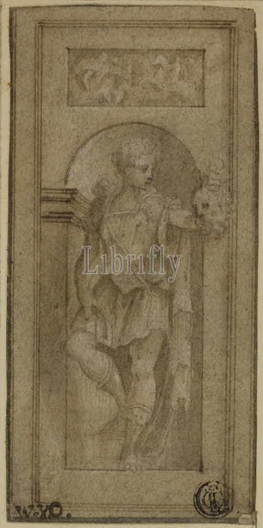 Niche Statue, David, Head, Goliath, n.d., Francesco de'Rossi, Salviati, Italian, 1510-1563, Giulio Campi, c. 1508-1573, Jacopo Sansovino, 1486-1570, Italy, Pen, brown ink, brush, brown wash, heightened, traces, white gouache, buff laid paper, laid down, cream card, 129