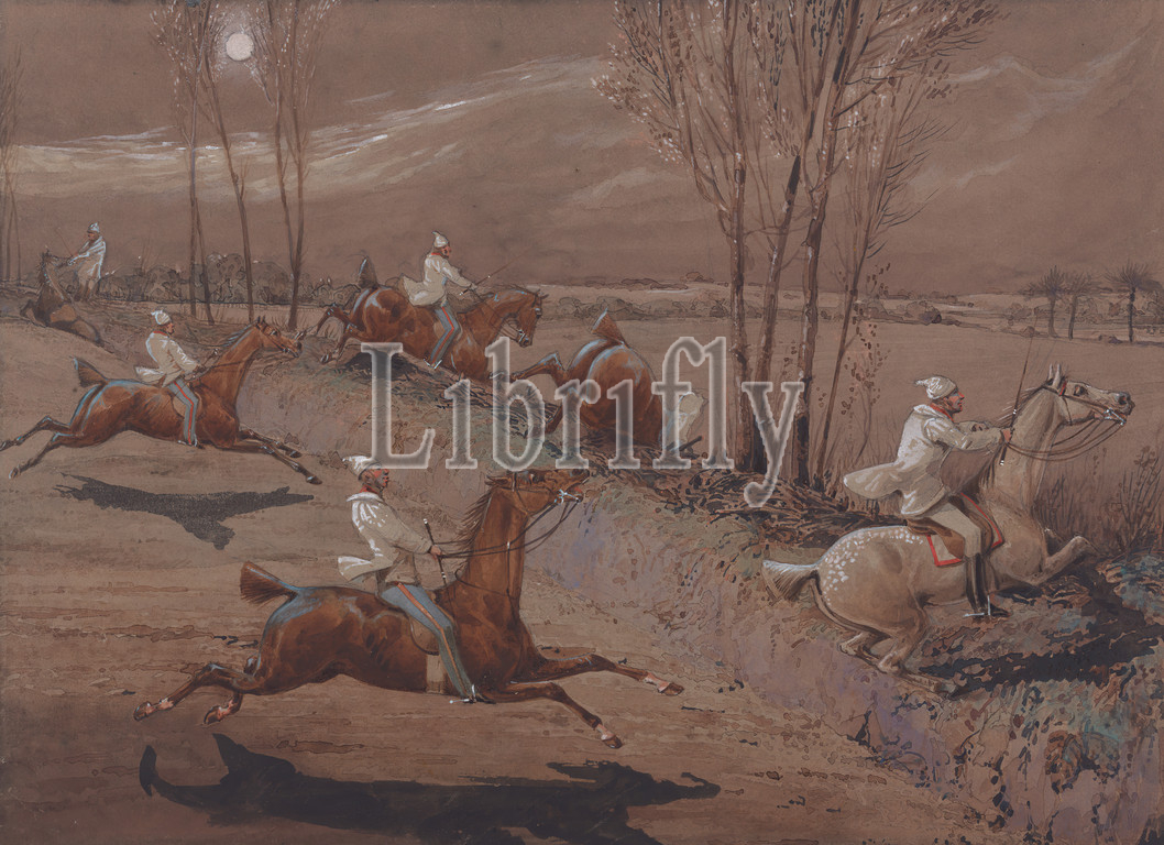 The Night Riders of Nacton: Whoop! and Away! The large field near Biles Corner, Henry Thomas Alken, 1785–1851, British, undated, Watercolor and gouache on medium, slighlty textured, brown wove paper mounted to thick card, Sheet: 10 1/8 × 14 1/8 inches (25.7 × 35.9 cm), horses (animals), men, moonlight, sporting art, trees, England, Europe, Suffolk, United Kingdom