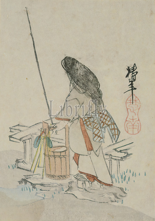 Ōnishi Chinnen, water drawing woman, color woodcut, total: height: 14,10 cm; width: 10,00 cm, signed: Chinnen 椿年, printmaking,printing, fountain, water (elements), Edo period