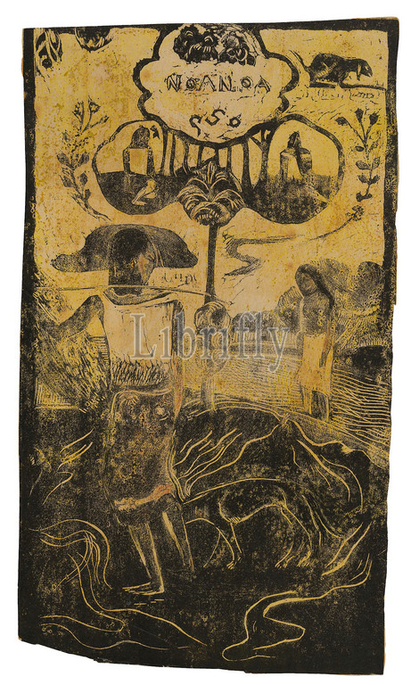 Noa Noa (Fragrant), from the Noa Noa Suite, 1893/94, Paul Gauguin, French, 1848-1903, France, Wood-block print in black ink, with touches of reddish-brown watercolor and black ink, over yellow ink tone block and transferred golden-yellow, orange, and green oil-based media, some containing beeswax and conifer resin (probably pine resin), on cream Japanese paper, laid down on heavy cream wove card, 358 × 205 mm