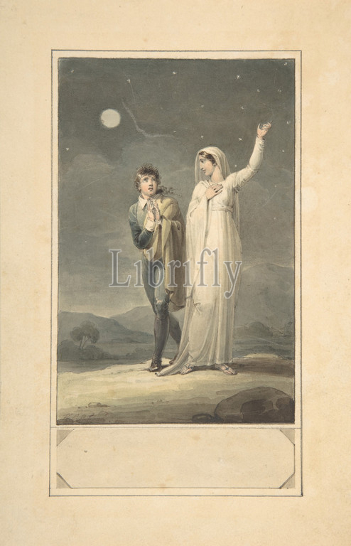 Nocturnal Landscape with Two Figures (design for an engraved book illustration), 1807–44, Watercolor over pen and brown ink and graphite, sheet: 5 1/8 x 3 3/8 in. (13 x 8.5 cm), Drawings, Henry Corbould (British, London 1787–1844 Robertsbridge, East Sussex)