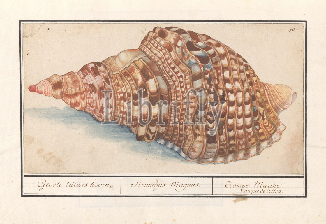 Normal triton horns, Charonia tritonis, large triton horn, Magnus Strumbus, Trompe Marine Conque de triton, title, object, Tritonshoren, Numbered top right, 10, Part, sixth album, drawings, fish, shells, insects, Sixth, twelve albums, animals, birds, plants, 1600, commissioned, Emperor Rudolf II, explanations, Dutch, Latin, French, Anselmus Boetius de Boodt, 1596, 1610, paper, pencil, chalk, watercolor, paint, deck paint, brush