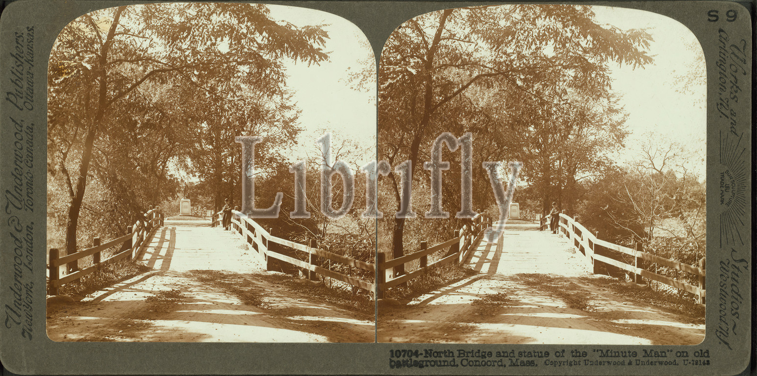 North bridge, statue, Minute Man, old battleground, Concord, Mass, image, Stereographs, 1910, Underwood & Underwood