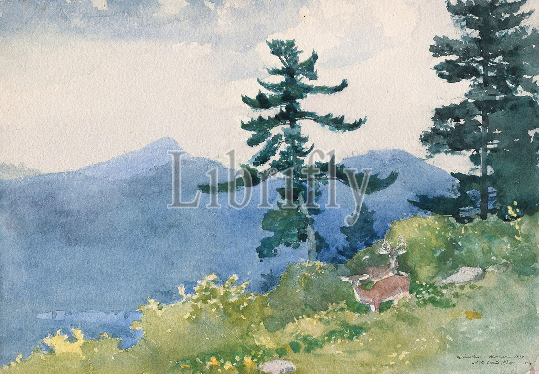 North Woods Club, Adirondacks (The Interrupted Tete-a-Tete), 1892, Winslow Homer, American, 1836-1910, United States, Watercolor, with rewetting, blotting and scraping, over graphite, on thick, moderately textured, ivory wove paper, 380 x 545 mm