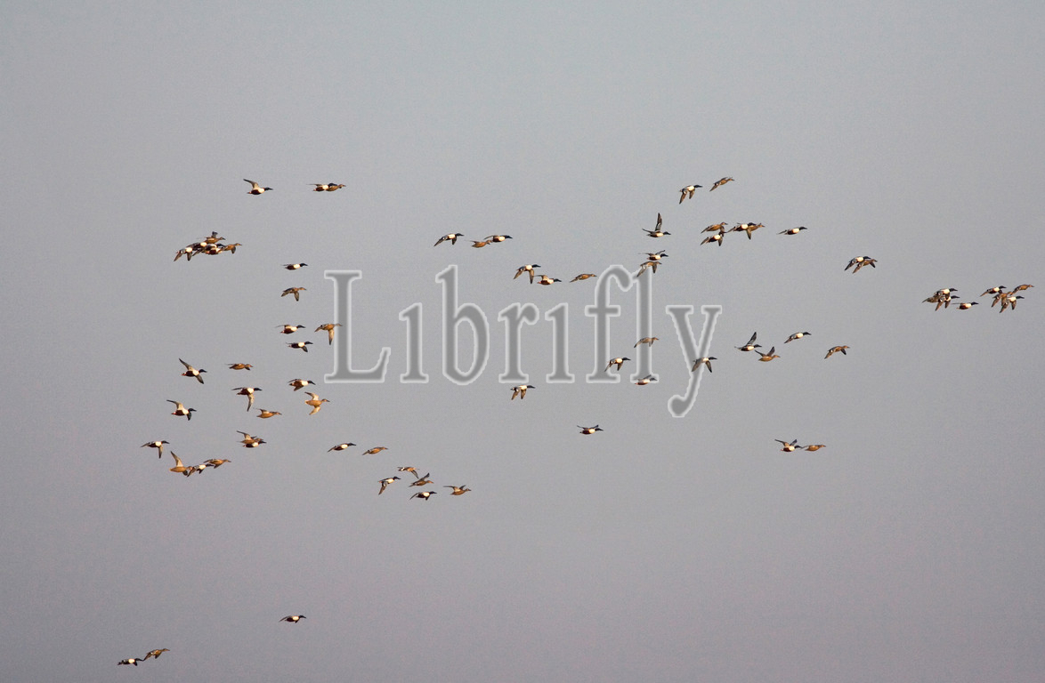 Northern Shoveler group flying, Spatula clypeata