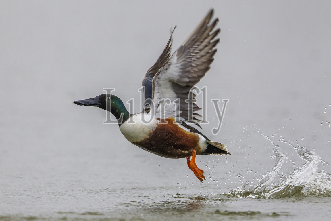 Northern Shoveler male in flight, Anas clypeata, Spatula clypeata, Italy