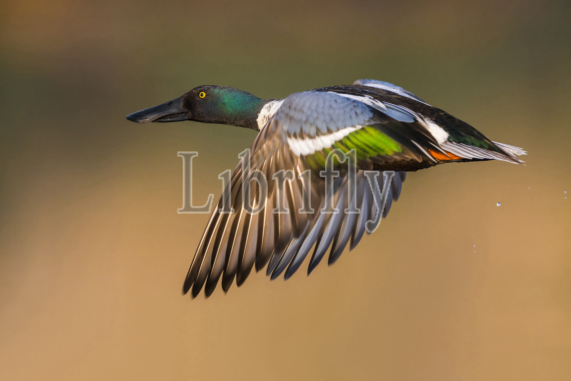 Northern Shoveler male in flight, Anas clypeata, Spatula clypeata, Italy
