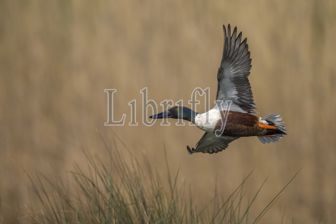 Northern Shoveler male in flight, Anas clypeata, Spatula clypeata, Italy