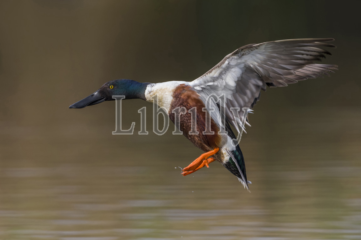 Northern Shoveler male in flight, Anas clypeata, Spatula clypeata, Italy