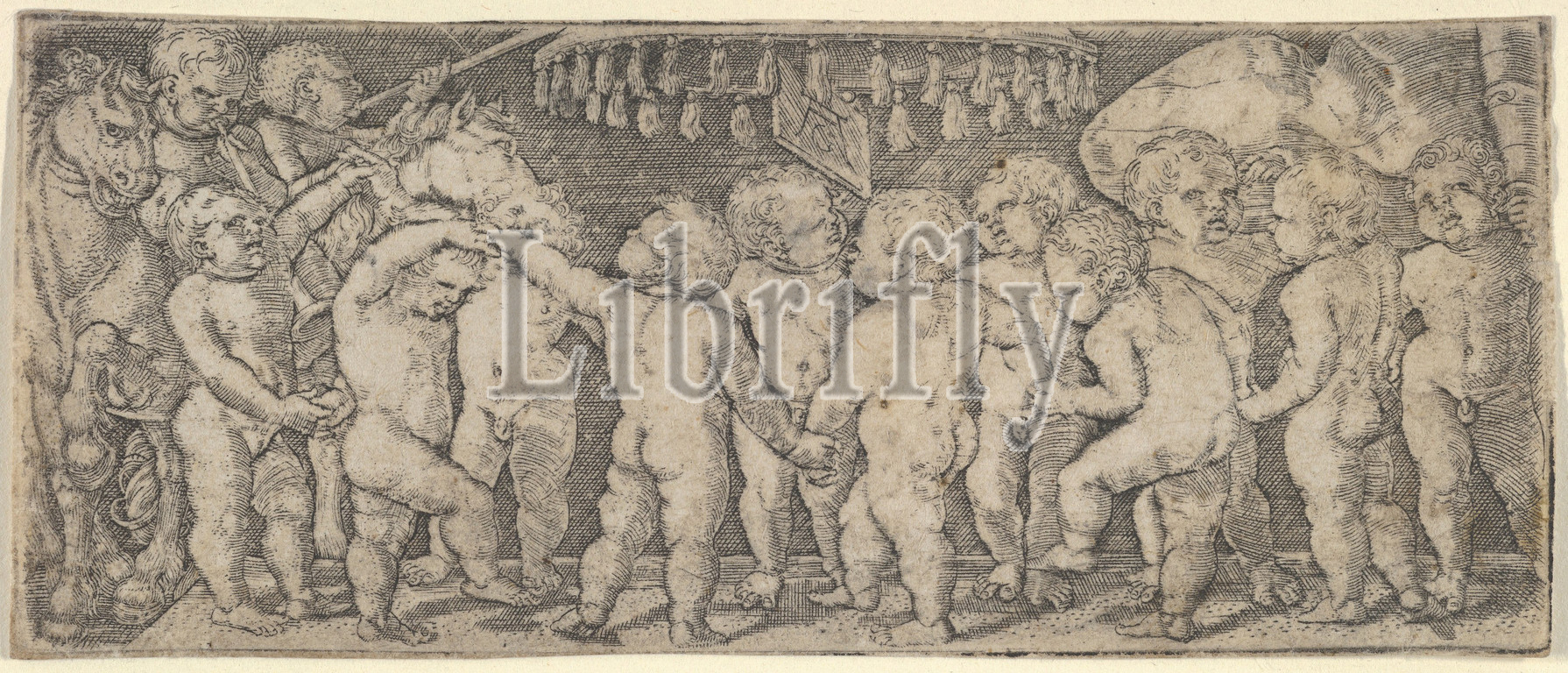 Nude Children Dancing Under a Canopy, with Two Horses on the Left and a Banner on the Right, ca. 1532–33, Engraving, Sheet: 1 11/16 × 4 1/8 in. (4.3 × 10.4 cm), Heinrich Aldegrever (German, Paderborn ca. 1502–1555/1561 Soest)