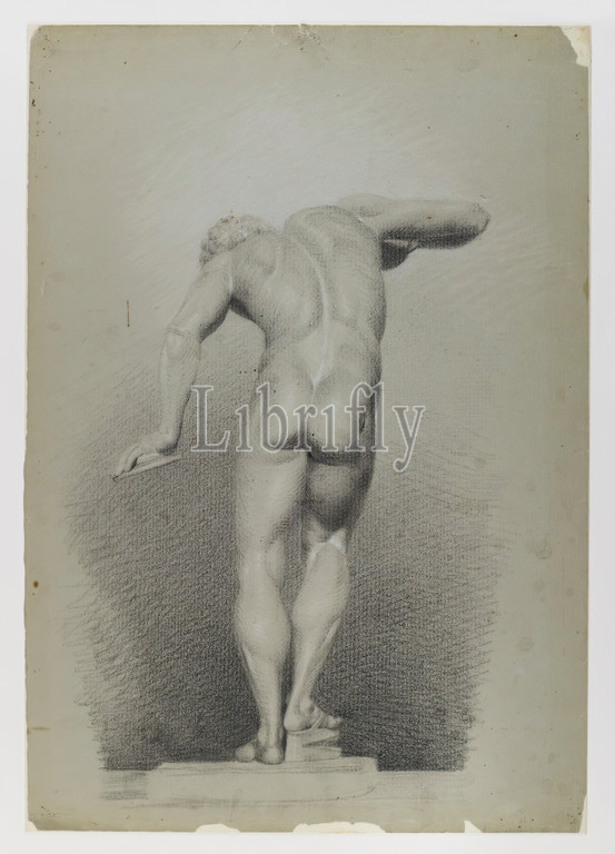 Nude Study, Daniel Huntington, American, 1816-1906, Black and white crayon on blue-green, medium-weight, slightly textured wove paper, ca. 1848, Sheet: 21 3/4 x 15 1/8 in., 55.2 x 38.4 cm, 19th Century, American, athlete, drawing, fine lines, male, male beauty, muscular, nude, Olympian