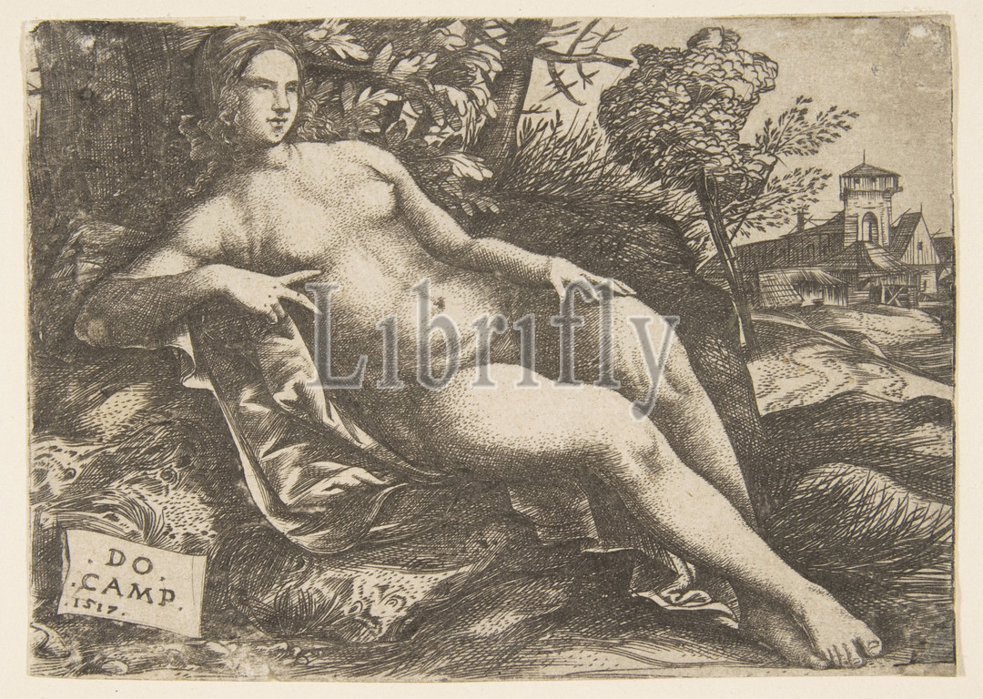Nude woman, Venus, reclining, landscape, 1517, Engraving, Sheet, trimmed, plate, 3 3/4, 5 5/16, 9.5, 13.5 cm, Prints, Domenico Campagnola, Italian, Venice, 1500–1564, Padua, In the manner of Giulio, Padua ca., 1482–ca., 1515/18 Venice, possibly, based on a prototype by Giorgione, Castelfranco Veneto, 1477/78–1510