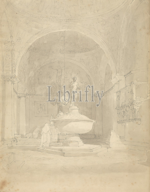 Nuns Praying, Altar, Church, Sir Robert Smirke, younger, 1781–1867, British, 1802-1804, Gray wash, graphite, moderately thick, moderately textured, beige, wove paper, Sheet, altar, apse, archways, Catholicism, church, crucifix, Doric, kneeling, monument, nuns, paintings, praying, religious, mythological subject, statue