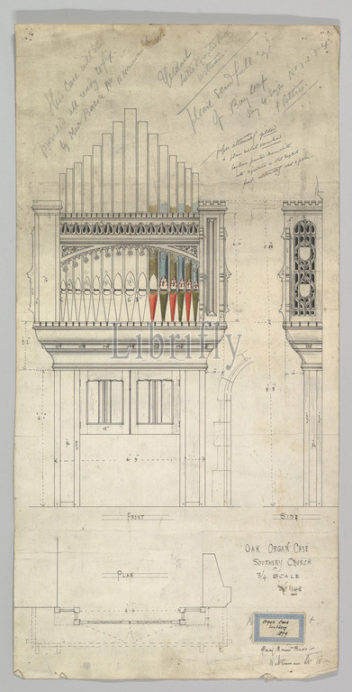 Oak Organ Case Southery Church, late 19th–early 20th century, Pen and ink over graphite with watercolor, Ernest Geldart (British, London 1848–1929)