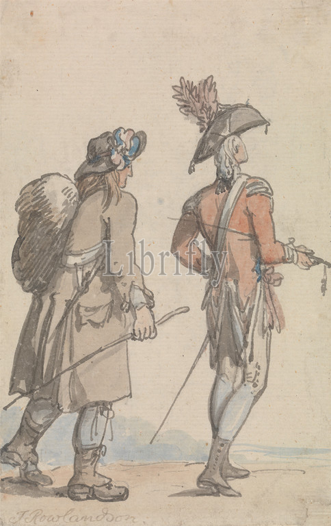 An Officer and his Servant, Thomas Rowlandson, 1756–1827, British, undated, Watercolor with pen and gray ink over graphite on medium, moderately textured, blued white laid paper, Sheet: 6 1/8 x 3 7/8 inches (15.6 x 9.8 cm), boots, coat, digging, duffel bag, genre subject, hats, house, men, officer (military officer), servant, shovel, trees, uniform, walking, wheelbarrow