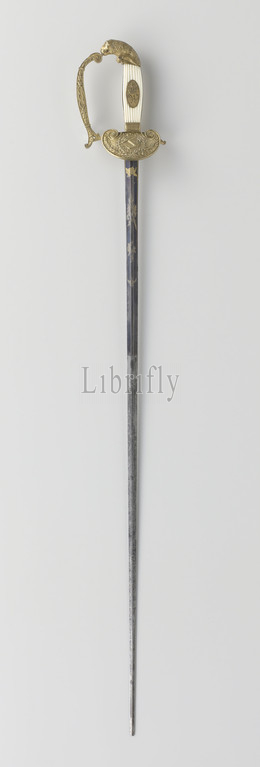 Officer's Sword, so-called 'é tat-major epee' without sheath, with broken point. Straight blade with flattened diamond-shaped cross-section, one-third blued from the grip and damaed-in with gold. The handle plates are of ribbed ivory, with a gold-plated oval handle shield with a crowned monogram of King Willem I in the middle. The hilt knob is in the shape of a half-climbing lion, front bar decorated with tendrils, guard rod with hanging baffle plate and anchor in laurel branch., Peter Knecht (attributed to), Solingen, 1820 - 1830, kling, gevest, greep, felt (textile), engraving, sword: l 91.2 cm blade: l 77.7 cm × w 2 cm hilt: l 16.5 cm