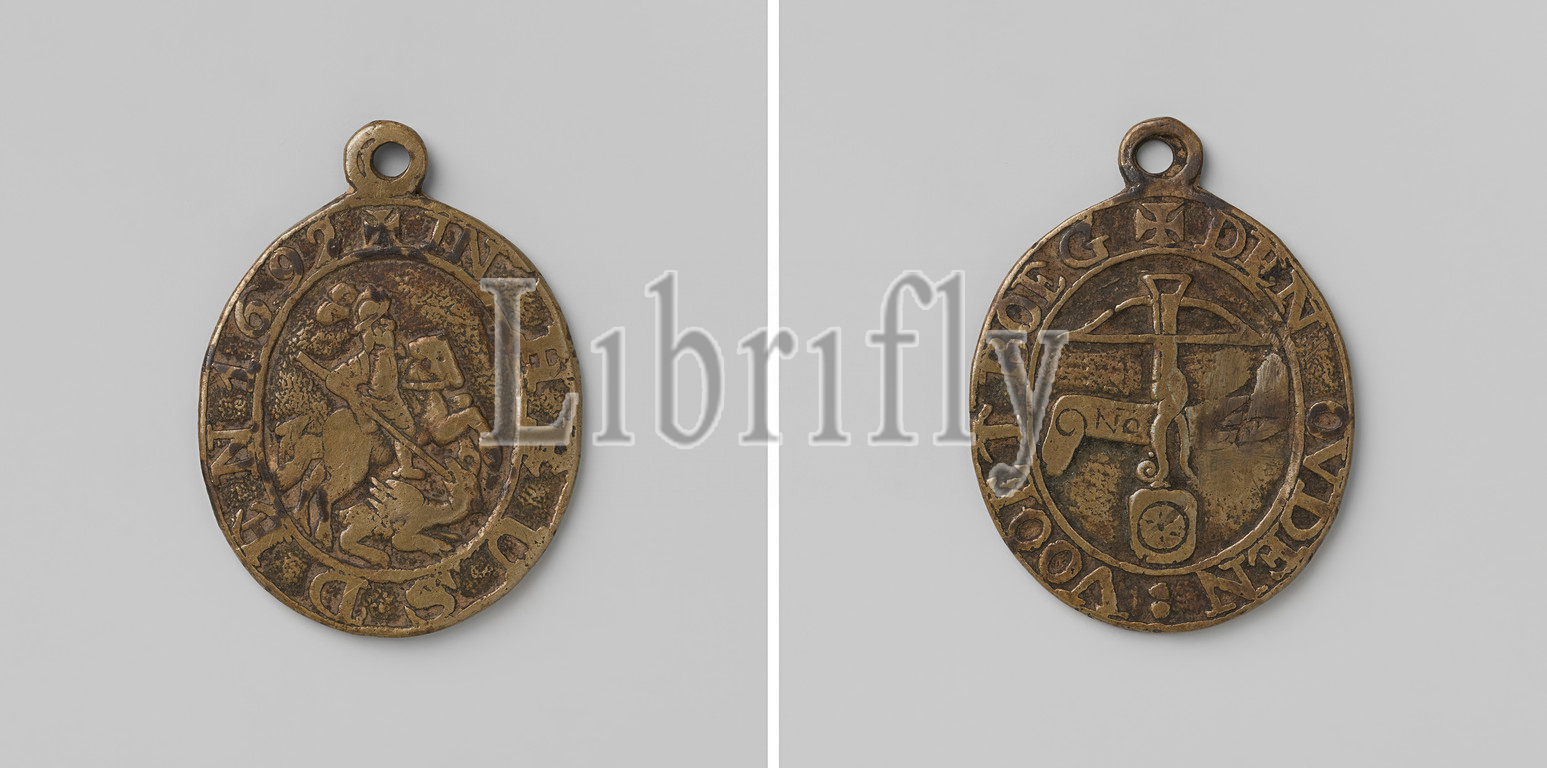 Old archery militia in Heusden, archer's medal with no. 4, Brass oval medal with bearing eye. Obverse: helmeted St. George on horseback with spear in right hand fights lying dragon within a circle. Reverse: foot arch above rose, behind it: ribbon with number no. 4 inside an inscription, Heusden, anonymous, 1692, brass (alloy), engraving, h 4.2 cm × w 3.2 cm × w 12.83 gr
