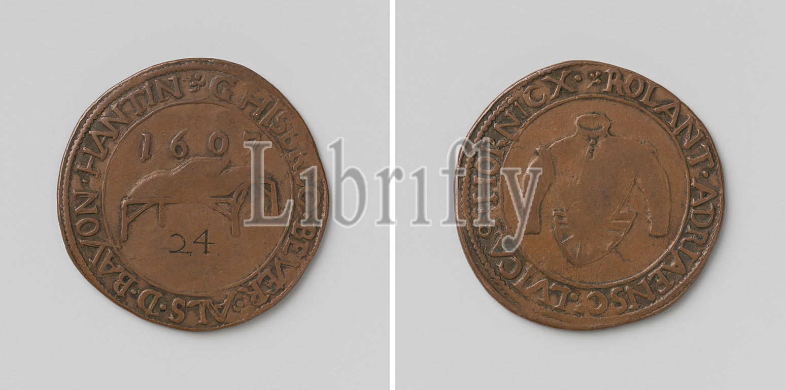 Old clothing guild of Middelburg, guild token with no. 24, Copper medal. Front side: cantilever table, on which clothing is placed below the date above the figure 24 within an inscription. Reverse: jerkin within circumference, Middelburg, Ghisbrecht Bever, Bavon Hantin, Rolant Adriaensc, Luicas Hornicx, anonymous, 1607, copper (metal), engraving, d 3.4 cm × w 10.68 gr