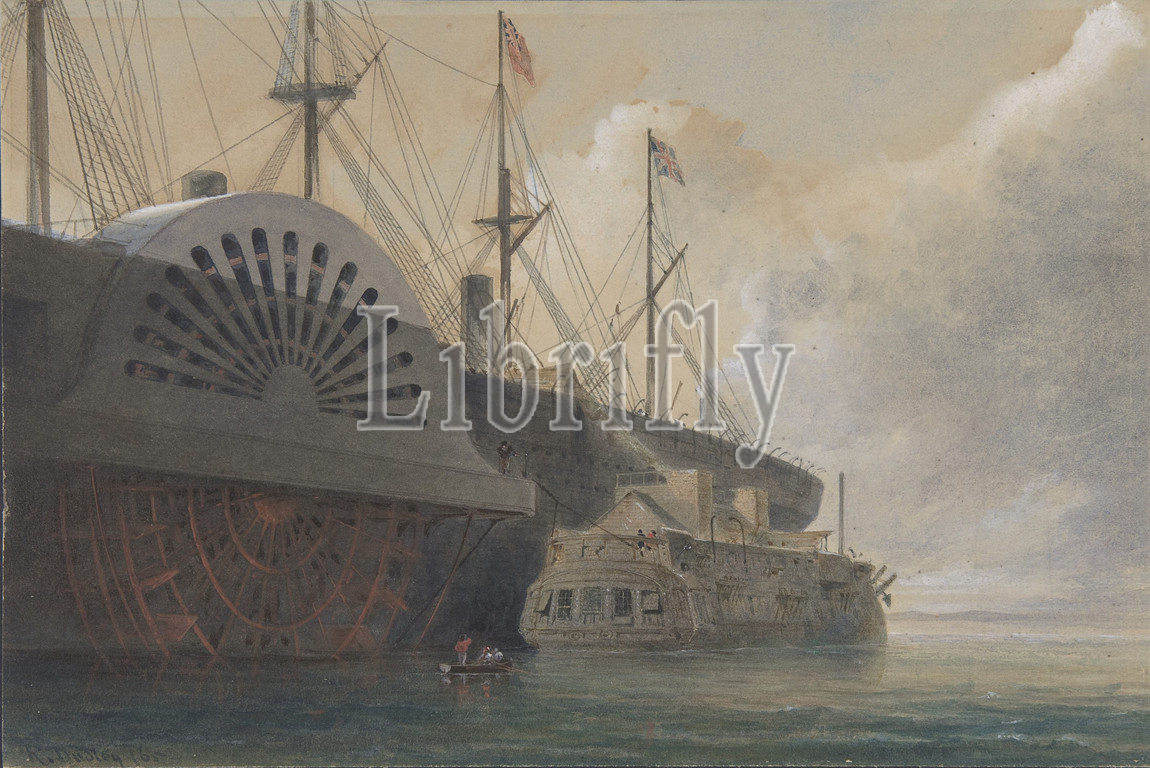 Old Frigate Iris, Freight, Cable Alongside, Great Eastern, Sheerness, Passed, Hulk, 1865, Watercolor, graphite, touches, gouache, Sheet, 6 7/16, 9 11/16, 16.3, 24.6 cm, Drawings, Robert Charles Dudley, British, 1826–1909, 19th century, great technological achievements, lay, telegraphic cable, beneath, Atlantic, allowing messages, speed back, forth, North America, Europe, minutes, ten, twelve days, steamer