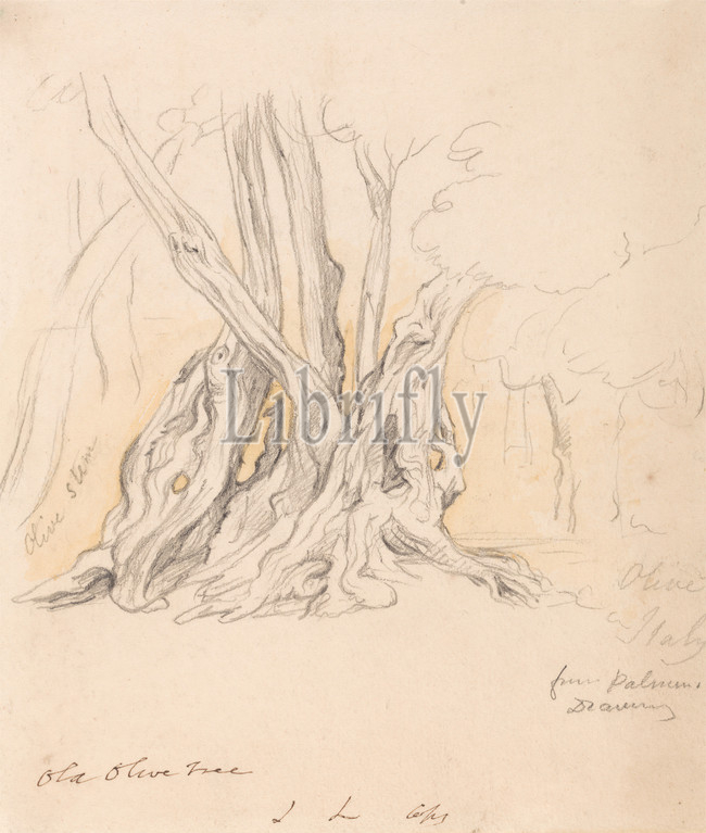 Old Olive Tree, John Linnell, 1792–1882, British, Samuel Palmer, 1805–1881, British, active, Italy, 1837–39, Graphite, watercolor, moderately thick, slightly textured, cream, wove paper, Sheet, branches, landscape, old, olive tree, roots, tree, trunk, woods, Europe, Italy