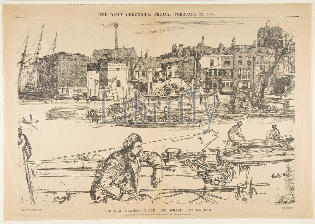 Old Thames, Black Lion Wharf, Etching, 1895, Wood engraving, image, 11 3/16 x 16 7/8, 28.4 42.9 cm, Prints, After James McNeill Whistler, American, Lowell, Massachusetts, 1834–1903, London, Engraved by Carl Hentschel, British, active, 1890s