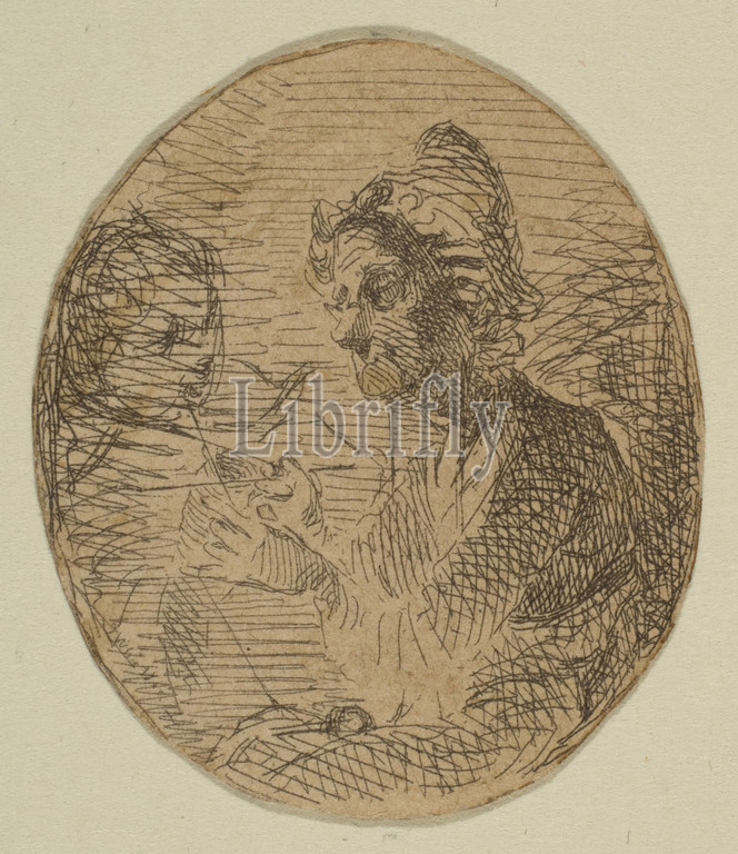 Old Woman, Child, Oval, Sketches, Coast Survey Plate, 1854–55, Etching, proof impression, state, Glasgow 1, fragment cut, upper portion, Kennedy no, 1, Whistler, mounted, board, six, related fragments, Cited, Glasgow, earliest, impression, oval sheet, 1 7/16 x 1 1/4, 3.7 3.1 cm, Prints, James McNeill Whistler, American, Lowell, Massachusetts, 1834–1903, London, first etching, employed, draftsman, U.S, Coast, Geodetic Survey, Washington, D.C, 1854, 1855, staff member taught, technique, supplied, copper plate, etched topographic, renderings, coastlines, sketched freely, drawing, figures