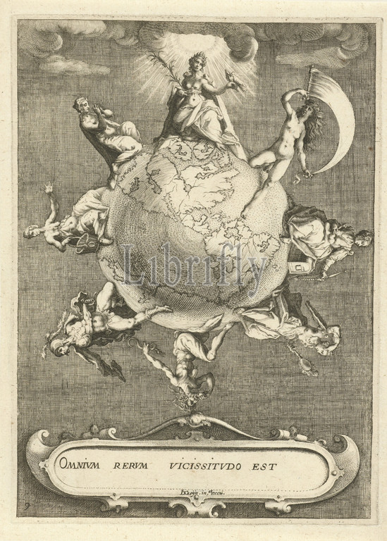 Omnium rerum Vicissitudo est, title, object, fortunes, life, series title, Globe, virtues, vices, separately, series, round circle, right, left, Fortitudo, Wealth, Superbia, Invidia, War, Poverty, Faith, upper center, Peace, head, wreath, clouds, divine light shines, Bottom center, cartouche, Nr, 9, determine, human life, Vicissitudes, Life, symbols, allegories, peace, Pax, Pace, Ripa, Luck, Fortune, Lot, Fato, Fortuna, Fortuna aurea, Fortuna buona, Fortuna pacifica overo clemente, Sorte, Pride, personification, Seven Deadly Sins, Envy, Anger, Ira, Lust, Luxury, Luxuria, Lussuria, Deadly Sins, Sloth, Indolence, Acedia, Desidia, Accidia, Fides, Fede, Fede catholica, Fede christiana, Fede christiana catholica, Three Theological Virtues, globe, Zacharias Dolendo, Leiden, c, 1596, 1597, paper, engraving