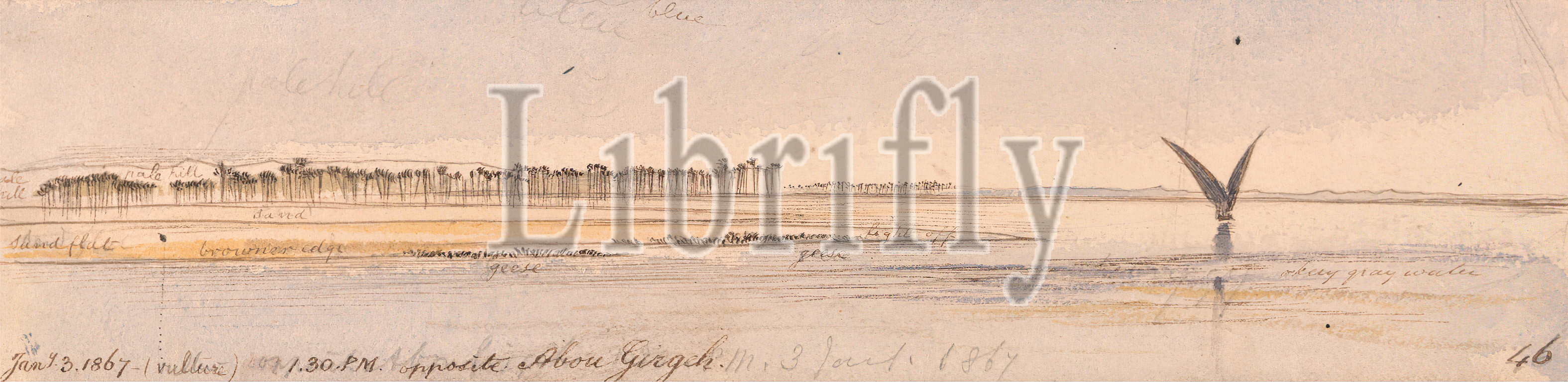 Opposite Abu Girgeh, Edward Lear, 1812–1888, British, 1867, Watercolor, graphite, pen, brown ink, moderately thick, moderately textured, beige wove paper, Sheet, birds, geese, landscape, palm trees, river, river, sky, vulture, water, Abu Qurqâs, Africa, Egypt, Nile