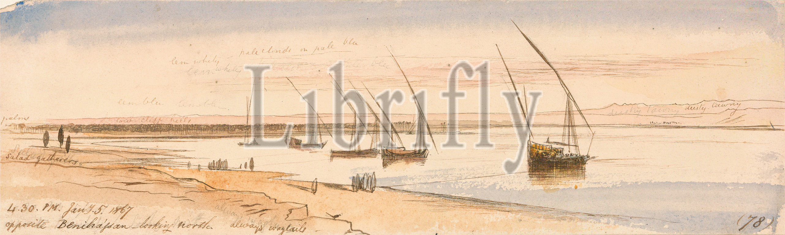 Opposite Beni Hassan, Looking North, Edward Lear, 1812–1888, British, 1867, Watercolor, graphite, pen, brown ink, medium, slightly textured, beige, wove paper, mounted, thick, moderately textured cream paper, Sheet, boats, figures, representations, marine art, river, river, riverbank, sand, sky, water, Africa, Egypt, Nile