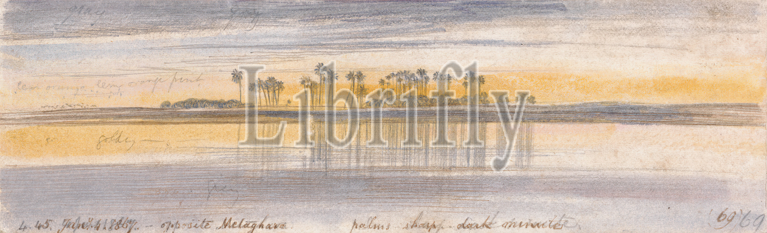 Opposite Melaghara, Edward Lear, 1812–1888, British, 1867, Watercolor, graphite, gouache, pen, brown ink, moderately thick, slighly textured, cream wove paper, Sheet, landscape, palm trees, river, river, sky, water, Africa, Egypt, Nile