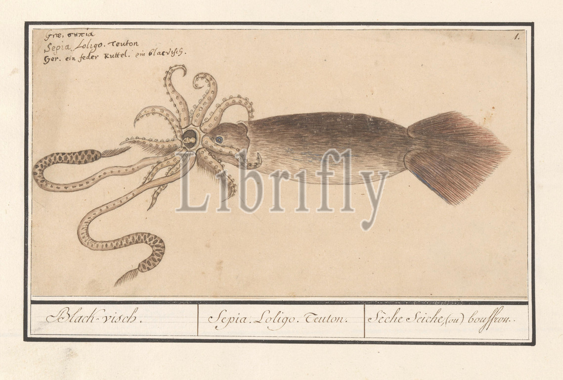Ordinary squid, Loligo vulgaris, Black-fish, Sepia, Loligo, Teuton, Sèche seiche, ou, bouffrou, title, object, Squid, Numbered top right, 1, Top left, name, three languages, Part, sixth album, drawings, fish, shells, insects, Sixth, twelve albums, animals, birds, plants, 1600, commissioned, Emperor Rudolf II, explanation, Dutch, Latin, French, molluscs, squid, Anselmus Boetius de Boodt, 1596, 1610, paper, pencil, chalk, watercolor, paint, deck paint, ink, pen