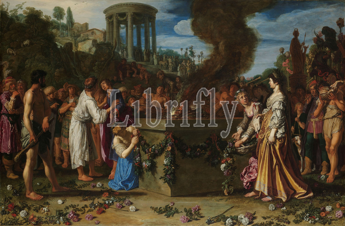 Orestes and Pylades Disputing at the Altar orestes and Pylades Disputing at the Altar, The sacrificial battle between Orestes and Pylades. The two friends are on the left of the altar with burning branches. On the left, the executioner waits with a club in his hand. On the right Iphigeneia who recognizes her brother Orestes, a girl throws flowers on the floor at her feet. A large crowd has gathered around the altar, on the left a girl is attaching a flower festoon to the altar. On the right is the statue of Artemis, on a hill in the background a round temple dedicated to Artemis from which a long procession runs down, Orestes and Pylades argue about who is going to be sacrificed, Pieter Lastman, 1614, panel, oil paint (paint), support: h 83.2 cm × w 126.1 cm d 6.5 cm