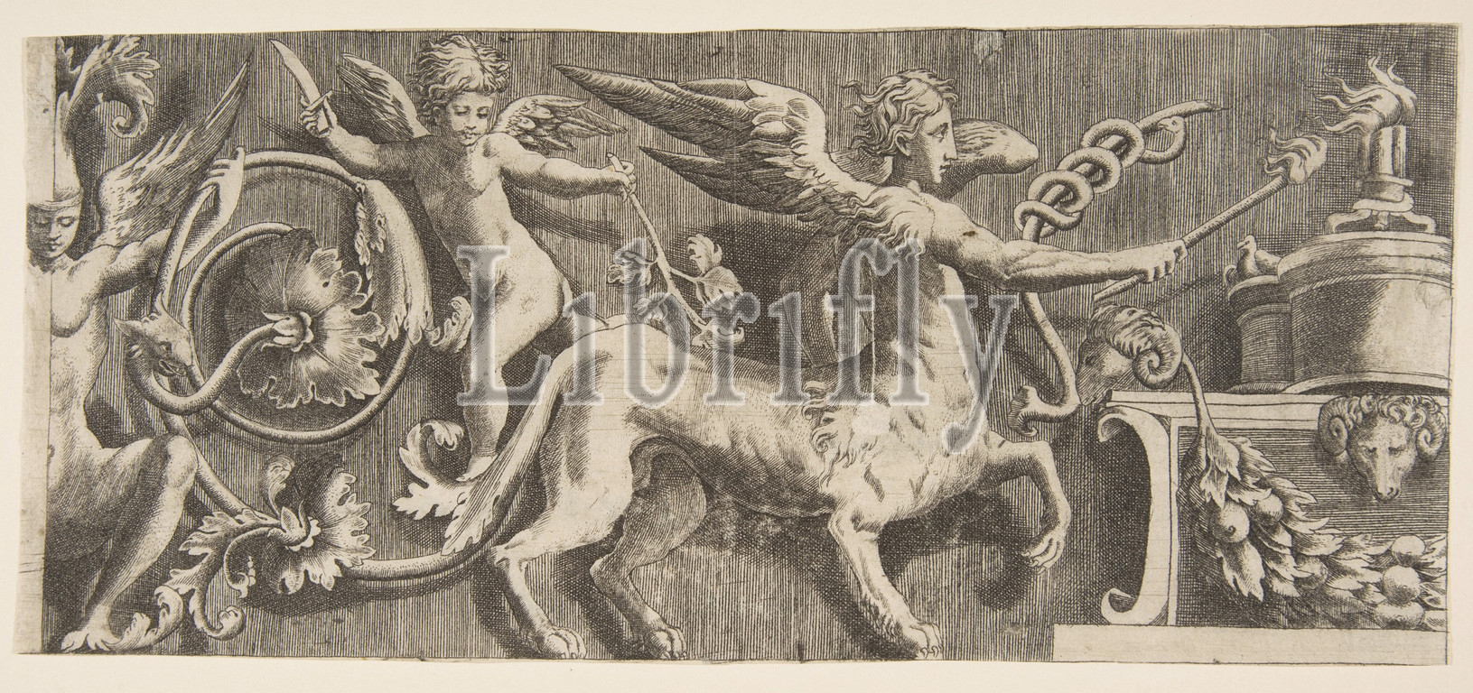 Ornament frieze, winged Centaur, 1531–76, Engraving, sheet, 4 15/16 x 11 9/16, 12.6 29.4 cm, Prints, Giulio Bonasone, Italian, active Rome and Bologna, 1531–after, 1576, After Parmigianino, Girolamo Francesco Maria Mazzola, Parma, 1503–1540, Casalmaggiore