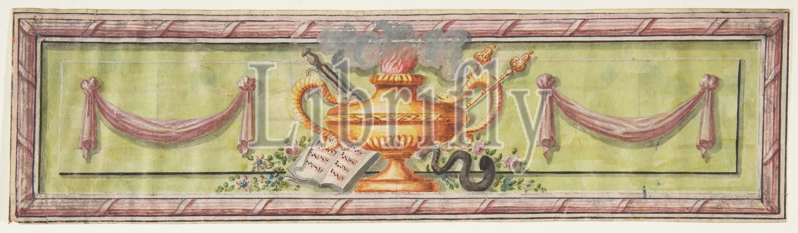 Ornamental Panel with Flaming Lamps and Sheet Music, 19th century, Watercolor on vellum, sheet: 4 x 14 in. (10.2 x 35.6 cm), Drawings, Anonymous, French, 19th century
